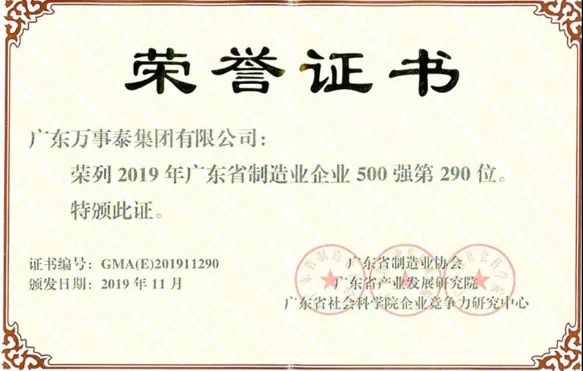 「喜讯」万事泰集团再次入选广东省制造业企业500强推荐