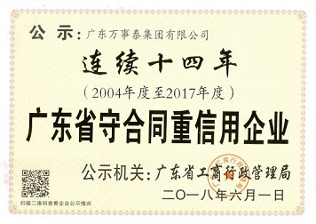 「喜讯」万事泰连续十四年荣获“广东省守合同重信用企业”称号推荐