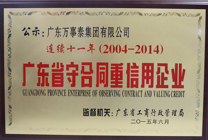 诚信在心,方能铸就一流百年企业2015年12月10日 ,以万事泰集团为首的46家企业,在新兴县工商局隆重接过了2014年度“广东省守合同重信用企业”的荣誉牌匾。这是秉承“诚信在心,方能铸就一流百年企业”的万事泰集团连续11年获得该荣誉称号。当天授匾仪式上,新兴县工商局局长陈小红系统总结了2014年度“广东省守合同重信用企业”公示工作的总体情况。据其介绍,今年全县共有49家企业公示为“广…