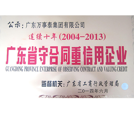 今年,我县在网上申报公示守合同重信用的企业,万事泰集团通过考核获得2013年度“广东省守合同重信用企业”连续10年的称号。
