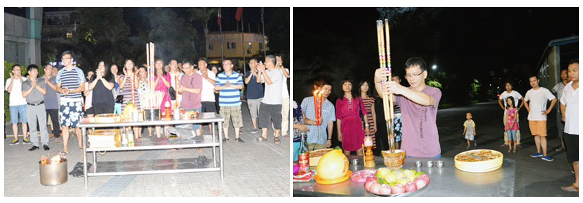 庄重而热烈的“中秋拜月”活动缓缓拉开序幕。拜月祭台上,摆设着香炉、月饼、水果等,祭台上摆放的红烛,与明月相映成趣。梁董事长依照古礼进行庄重的拜月仪式,参加活动的家人们也依次上香,共同祝愿万事泰人中秋快乐,阖家幸福,集团发展再创辉煌,更上一层楼。