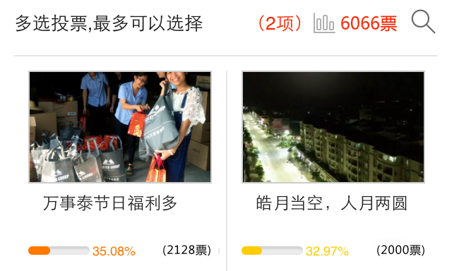 10月14日,“幸福万事泰人”微信投票活动揭晓,短短几天时间,投票总数超过6066张,其中,采购部练美英的《万事泰节日福利多》获得2128票,行政部苏瑞萍的《皓月当空,人月两圆》 获得2000票,分别获得此次评选的最佳人气奖第一、第二名。此次微信晒图活动,形式多样,题材各异,充分体现了万事泰人的风采与精神风貌。