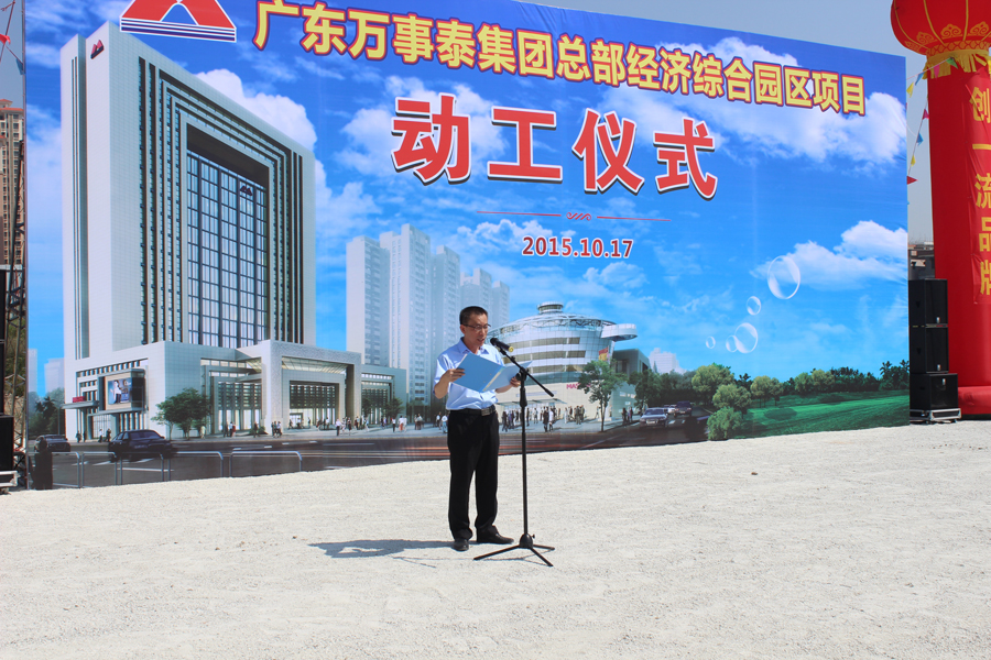 万事泰集团常务副总裁刘炳耀主持仪式,对园区项目作了详细介绍,集团董事长梁桂泉致辞,他代表万事泰集团对各位领导的出席表示热烈的欢迎,他在讲话中谈到,作为全省的两化融合试点单位,万事泰在引入自动化生产机器代人方面投入近8千万元,成效显著。万事泰目前加快厨电一体化发展,在厨具的基础上延伸到厨房电器一体发展,这项目也得到了政府的支持,现在正努力解决用地问题。集团大力加强互联网+和整体厨房项目发展,现已成立了独立公司,现正组建和筹备中。计划投入20多亿,这个项目是万事泰集团的重点品牌发展项目,十年可以实现年产值100亿的规模。新兴县人民政府副县长、县公安局局长韦钰作为政府代表作了讲话,对万事泰总部园区动工表示热烈祝贺,对万事泰在不锈钢餐厨炊具行业的示范作用,对推动新兴县工业的转型升级表示肯定,最后,市、县领导10余人代表参加动工培土仪式。