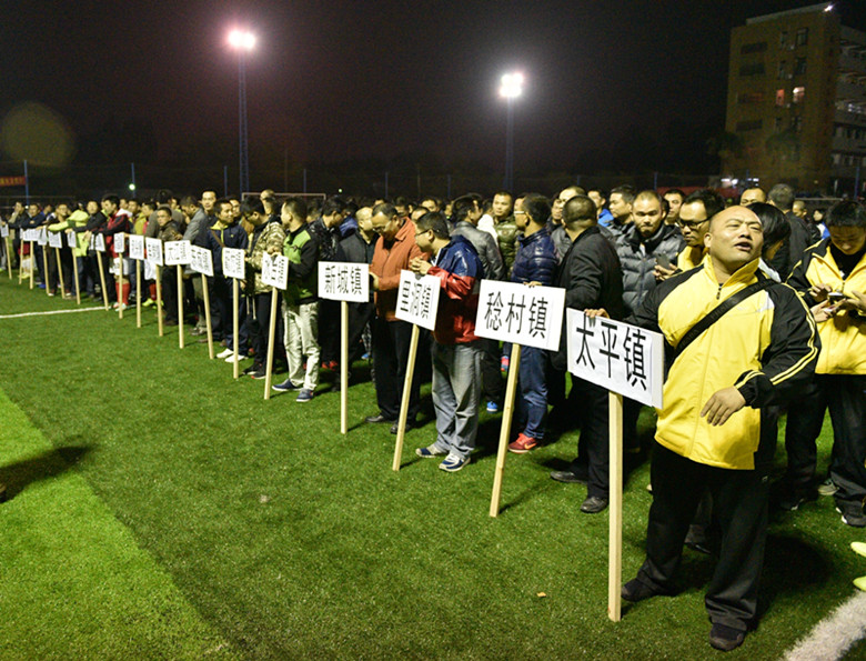 (参赛球队代表列队等待领取属于自己的荣誉,万事泰杯足球赛比赛激烈好看,各镇、系统参赛积极性高,可以称为新兴人自己的“中超”联赛。)