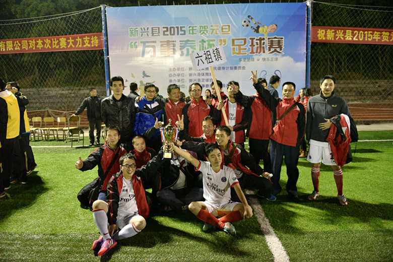 (实力强劲的六祖镇获得乡镇组冠军实至名归,球员以及球迷在万事泰杯足球赛巨大的展板前合影留念。)