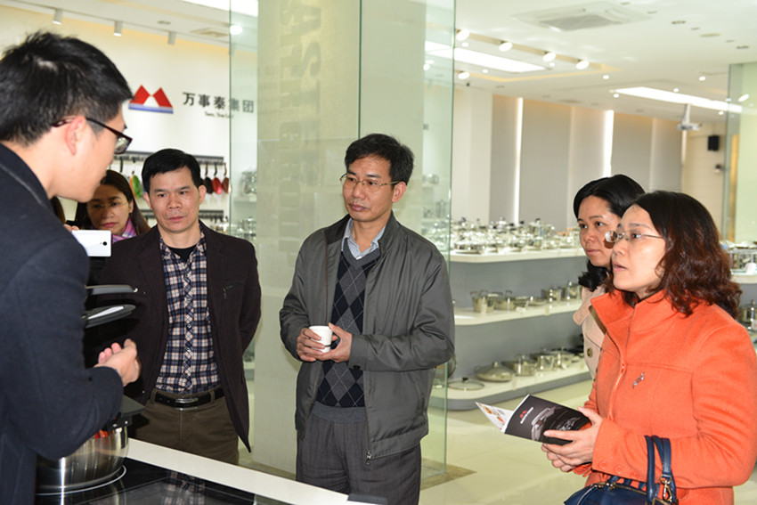 陈金德主任调研组一行首先参观万事泰智能厨房展厅,调研组对万事泰智能厨房非常感兴趣,智能厨房产品上传感器的应用、工艺技术的创新、产品的设计理念,都一一得到调研组的高度赞扬。调研组了解万事泰的新产品研发方向、理念以及车间自动化生产情况。调研组介绍了促进中心的总体情况和服务功能,并对高企认定(培育)、工业设计等内容进行宣讲,旨在将中心优势科技资源与专业镇服务需求进行有效对接,为专业镇及广大中小微企业服务,推动专业镇转型升级。