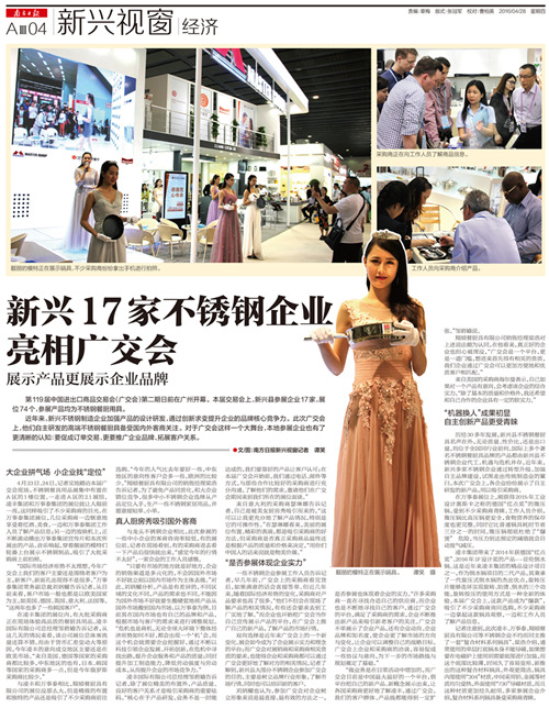 历经30 多年发展,新兴县不锈钢餐厨具名声在外,无论质量、性价比,还是出口量,均位于全国同行业前列。国际上多个著名不锈钢餐厨具品牌的产品都由新兴县不锈钢企业代工。机遇与危机并存,近年来,新兴多家不锈钢企业通过转型升级、加强自主品牌建设,试图走出传统制造业的窠臼。本次广交会上,各企业纷纷展示了自主研发的新产品,用以吸引采购商。