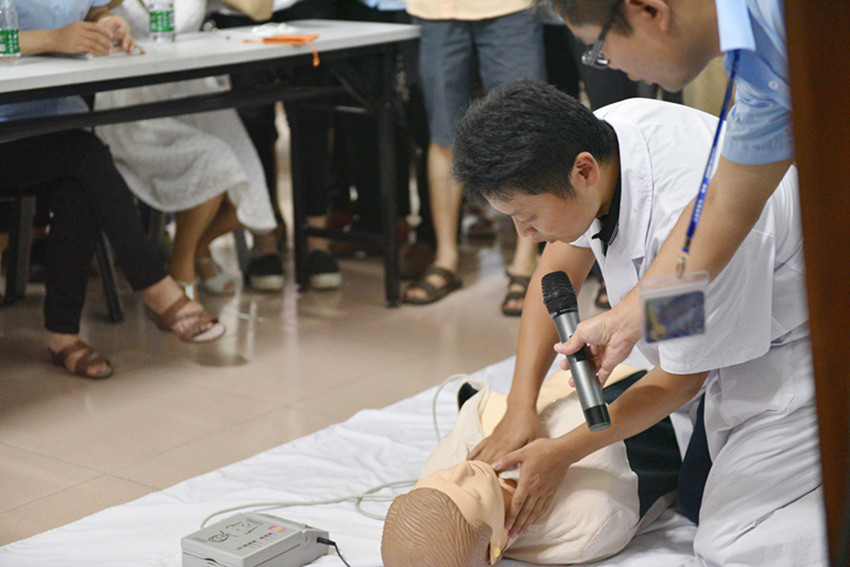 现场演练中,学员们围成一个圈认真听万承俊医师讲解动作步骤