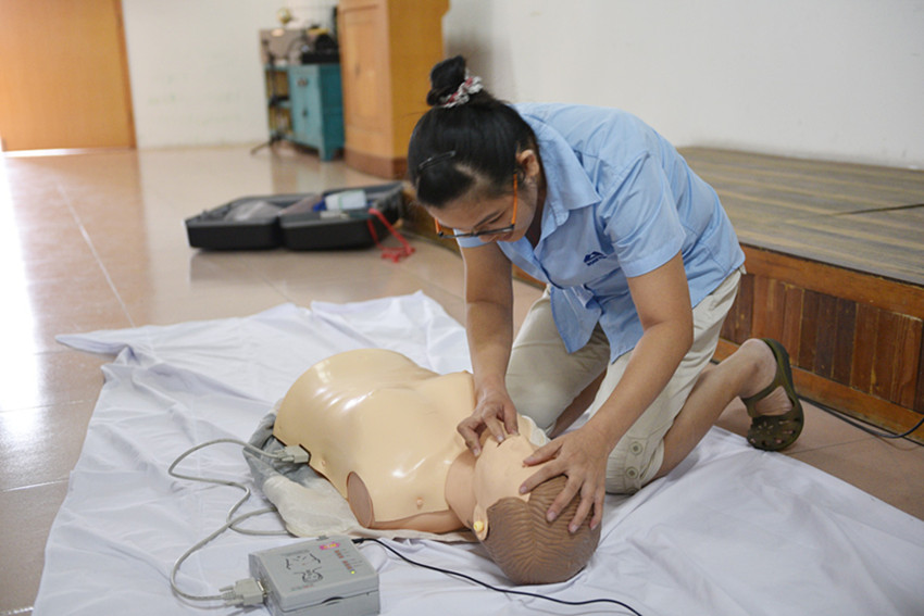 培训会上,老师以知识宣讲、图片展示、教学短片播放、模拟操作等方式向现场学员们生动讲解正确的急救知识和操作方法。理论学习过程中,学员们端坐桌前,认真听讲,不时提出自己的疑问。实践操作中,学员们积极主动参与,并跟随老师的示范,谨慎细致地完成每一个急救动作。学员们的课堂表现得到老师的充分认可。