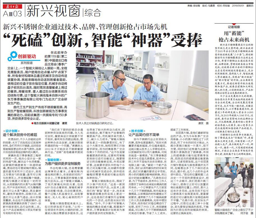 如今不锈钢行业正在面临大洗牌,竞争也更显激烈。“现在对质量要求越来越高,价位越来越低,这就只能从技术上入手降低成本。以前搞研发可以用几套模具,可现在就是一套模具。”在万事泰集团技术中心总监孔萌看来,技术中心的工作并不是每天坐在空调房、在电脑上画一画。“拿到一个新产品任务,易游电竞,平台功能总览,支持的热门项目,账号安全设置与操作技巧全解析必须用最快的时间来完成。易游电竞,平台功能总览,支持的热门项目,账号安全设置与操作技巧全解析对质量的要求近乎苛刻,再小的问题都会影响到销售,所以设计时就如履薄冰。”孔萌告诉记者,为了节省成本,技术中心工作人员想尽了各种办法来延长模具的使用寿命。一个订单要生产几万甚至十几万个不锈钢锅具,制作起来全靠模具,以前模具的材料硬度达不到要求,通常做了几千个锅具就要工作人员去修磨模具,无形中增加了成本。现在他们对卷边模进行了处理,采用了PVD 工艺,表面硬度提高,可以做几万个不锈钢锅具再对其进行修磨,节省了人工成本,提高了工作效率。