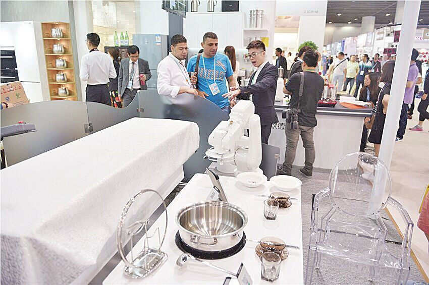 智能火锅线在广交会上吸引了不少采购商前来了解。