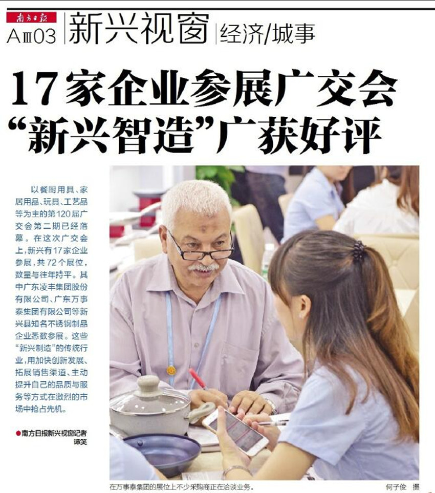 这几年,新兴县不锈钢制品产业出口形势严峻,去年出口额甚至还出现了负增长,前景不容乐观。在此环境下,新兴县不锈钢行业抱团逆境发展,积极宣传推广地域性、行业性品牌,扩大出口贸易;与此同时,新兴县政府也对不锈钢行业大力支持。在本次广交会上,各企业一改以往各自宣传、单独作战的局面,由新兴县不锈钢商会统一承办了一场新兴县不锈钢行业品牌宣传的展示活动,进一步提升新兴品牌知名度和影响力,助力企业抢占国际市场。