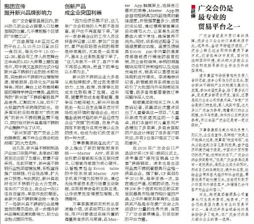 广交会展馆AB区交汇点的平台上,从10月23日至26日一连四天,每天中午12:00—12:30,都会有工作人员在舞台正中央的LED大屏幕上播放宣传片,用中英文互换的方式介绍新兴县不锈钢行业的技术和优势,突出新兴不锈钢行业智能制造、智能厨房、自动化生产线等特色;同时,舞台上还有高挑靓丽的模特手持设计精美、品质优秀的“新兴造”不锈钢餐厨具产品走秀,汇聚四方人流,吸引了大批国内外采购商的目光。很多围观的采购商都对“质优貌美”的新兴不锈钢展品赞不绝口,同时也对新兴县高端不锈钢产业集群产生了认可。