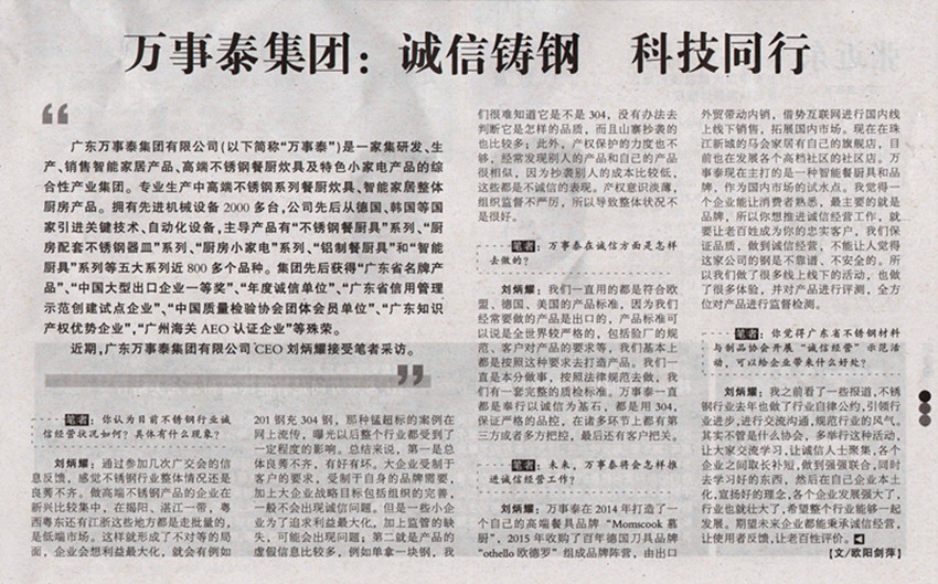 刘炳耀:万事泰在2014年打造了一个自己的高端餐具品牌“Momscook慕厨”,2015年收购了百年德国刀具品牌“othello欧德罗”组成品牌阵营,由出口外贸带动内销,借势互联网进行国内线上线下销售,拓展国内市场。现在在珠江新城的马会家居有自己的旗舰店,目前也在发展各个高档社区的社区店。万事泰现在主打的是一种智能餐厨具和品牌,作为国内市场的试水点。我觉得一个企业能让消费者熟悉,最主要的就是品牌,所以你想推进诚信经营工作,就要让老百姓成为你的忠实客户,易游电竞,平台功能总览,支持的热门项目,账号安全设置与操作技巧全解析保证品质,做到诚信经营,不能让人觉得这家公司的钢是不靠谱、不安全的。所以易游电竞,平台功能总览,支持的热门项目,账号安全设置与操作技巧全解析做了很多线上线下的活动,也做了很多体验,并对产品进行评测,全方位对产品进行监督检测。