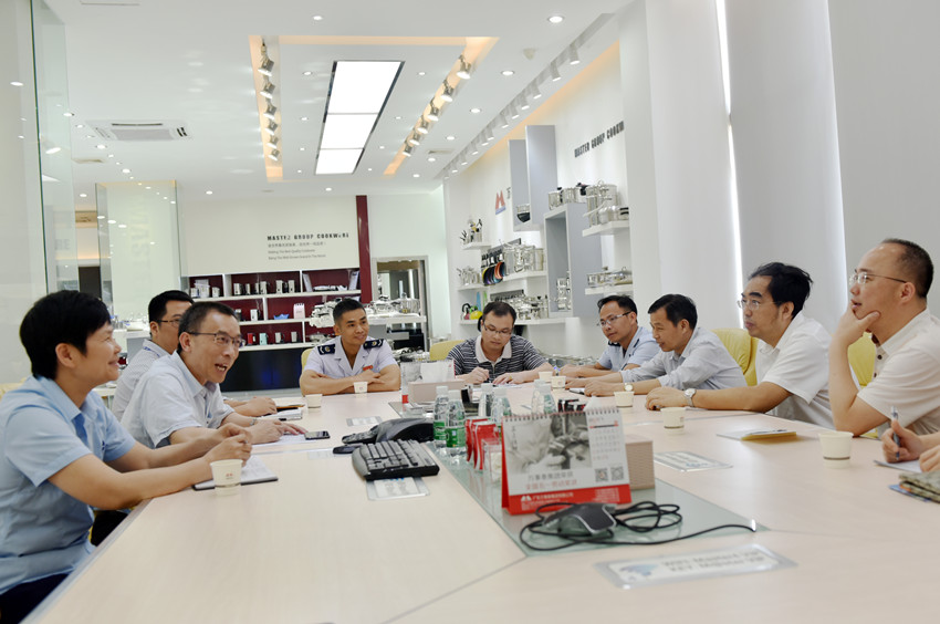 调研团一行先后来到全景厂区沙盘模型、四楼智能餐厨具产品展示厅,刘总向大家介绍了荣获德国红点奖的智能微压锅、广交会上备受关注的智能健康大厨房等系列产品。调研团对万事泰集团近年来在转型升级的道路上收获到的累累硕果表示赞叹不已。