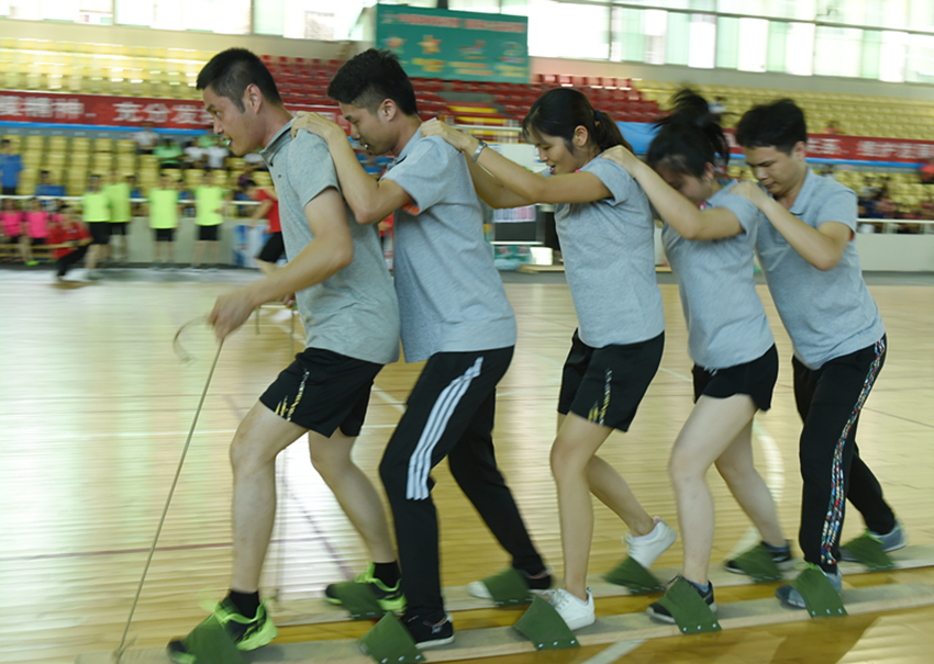 在裁判长的一声“哨”令下,六项比赛项目井然有序地开展起来。在“齐心协力”的比赛中,万事泰集团员工们的表现最为突出,只见5名队员列成一排,双脚站在协力竞走器上,顺着“一二、一二...”的口号拍子,同心协力地向着起点的另一边奋进。