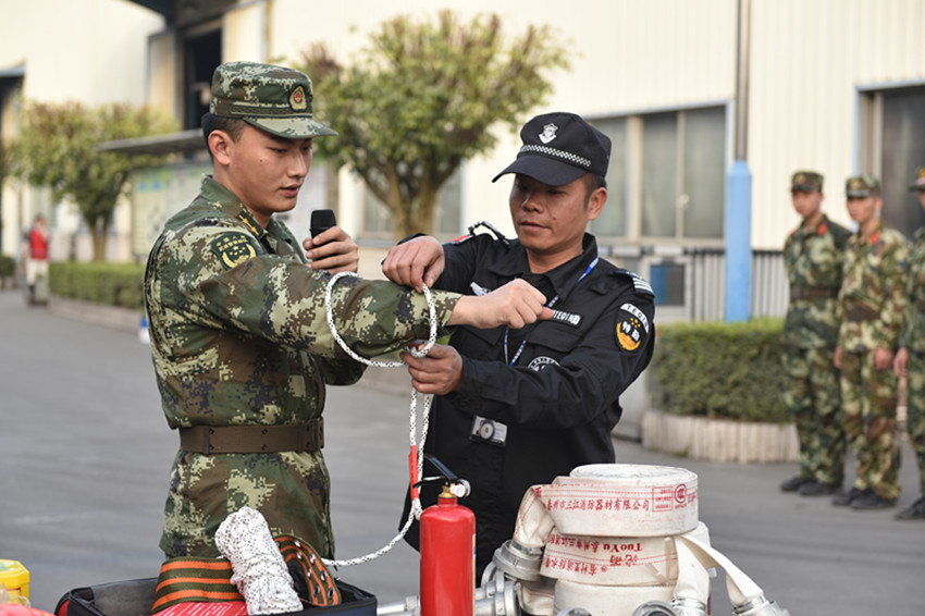 消防官兵耐心为万事泰员工讲解消防器材使用的消防知识。