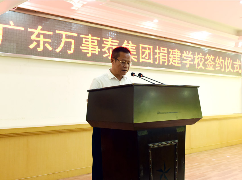 县委副书记、县长袁伙月代表新兴县委、县政府作了讲话,他对万事泰集团捐资办学、热心公益之举表示了高度赞扬和衷心感谢。他指出,县委、县政府历来都高度重视教育事业的发展,充分发挥社会力量捐资办学,进一步改善和提升基础教育质量和水平,是一条可行的办法。袁县长要求,各有关职能部门要关心、支持项目建设,密切配合,尽快部署前期工作,落实建设筹备工作,确保新学校如期建成,如期启动招生工作,要把万事泰集团捐建的新兴县万事泰实验学校办成一所让学生向往、家长放心、社会满意的优质学校。