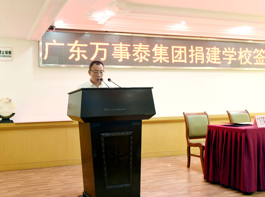 万事泰集团常务副总裁刘炳耀先生代表集团上台致辞,他表示,万事泰今天捐资5000万元建设新兴县万事泰实验学校,是以实际行动关心与支持家乡的教育事业发展,为县委县政府实施建设教育强县战略、解决当前我县城镇化建设步伐加快与基础教育学位紧张的矛盾尽一份绵薄之力。