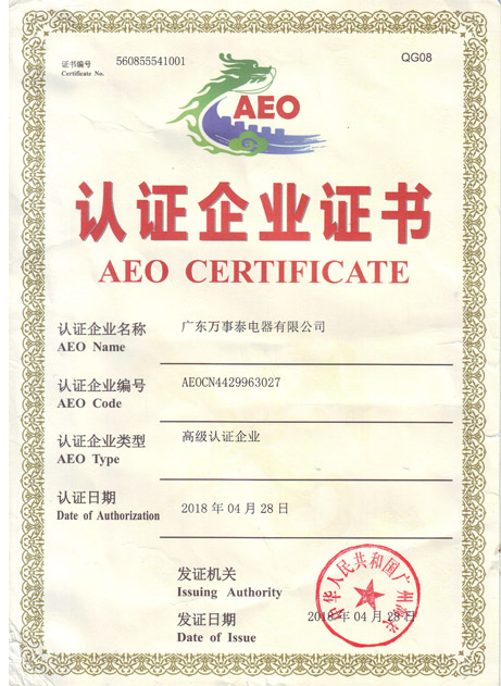 据悉,海关高级认证企业全国审核通过率仅为5%,通过企业是世界海关组织认定的信用等级高的企业,可以说是外贸企业的诚信典范和先进标杆。万事泰电器公司此次获得AEO高级认证资格,是海关对我司长期以来追求高效品质、规范化管理、规范化发展、诚信立业的充分认可。未来,万事泰电器公司将以此为新的起点、新的契机,在继续强化内部管理的同时,充分利用AEO在全球通关的便利条件,加大国际市场的开发与合作力度,增加企业产品海外覆盖度,提升企业品牌全球知名度和影响力,使企业获得更快、更稳、更强的发展。