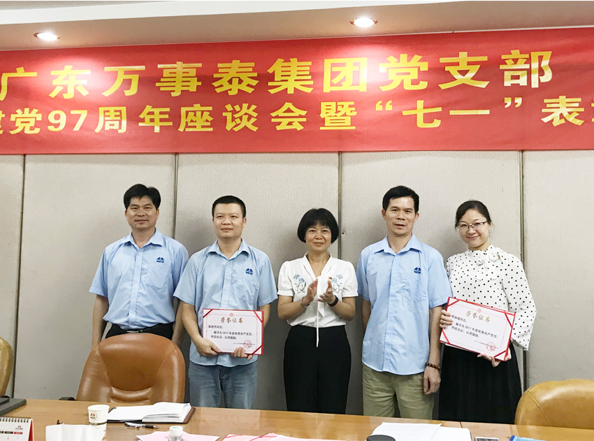 会上,党员们一起学习观看党的光辉历程纪录片,共同回忆中国共产党从成立走向胜利的岁月。随后,宣读表彰决定,万事泰集团党支部荣获先进基层党组织称号,陈永锦、梁洪光、练美英、梁志权、李丽娥、温文翠、梁进杰七位同志荣获2017年度优秀共产党员称号,此外,由系统党委副书记陈婉华对获得省劳动模范称号的刘炳耀同志和获得云浮市工匠称号的苏仲文同志进行颁奖。会议过后,希望受到表彰的先进基层党组织和个人,能够再接再厉、振奋精神、继续发挥战斗堡垒和先锋模范作用。