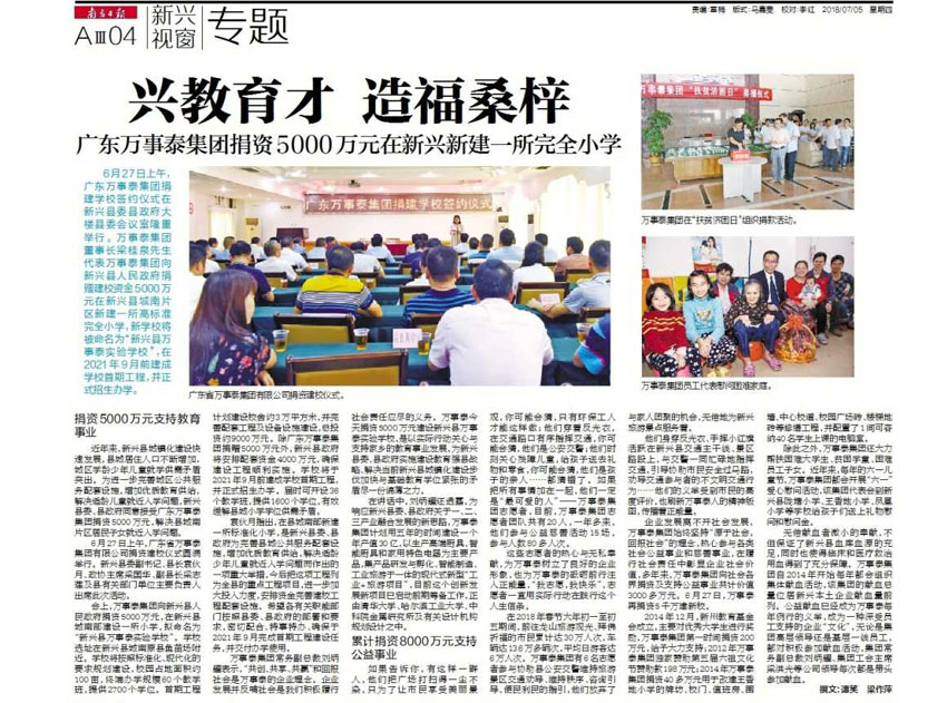 6月27日上午,易游电竞,平台功能总览,支持的热门项目,账号安全设置与操作技巧全解析捐建学校签约仪式在新兴县委县政府大楼县委会议室隆重举行。万事泰集团董事长梁桂泉先生代表万事泰集团向新兴县人民政府捐赠建校资金5000万元在新兴县城南片区新建一所高标准完全小学,新学校将被命名为“新兴县万事泰实验学校”,在2021年9月前建成学校首期工程,并正式招生办学。