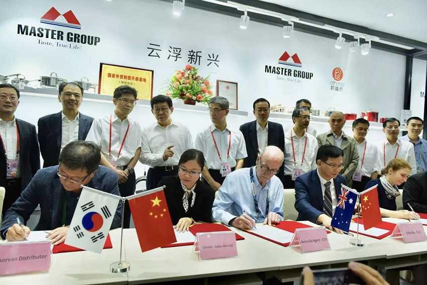 在陈德铭部长和黄书记调研过程中,适逢万事泰集团分别与俄罗斯、澳大利亚、韩国、以色列四家客商在广交会上达成othello(欧德罗)品牌代理与贸易协议并现场进行签约,陈德铭部长和黄书记等一行领导共同见证了双方签约仪式。
