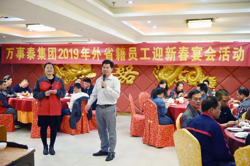 活动现场,大家围坐在洋溢着充满新春喜气的餐桌旁共进团年晚餐。万事泰工会主席梁洪光代表集团向家人们送来新年祝福并说道,“大家来自祖国各地,一年来兢兢业业工作、勤勤奋奋干事,新春佳节之际,谨代表集团对大家表示衷心地感谢。同时希望大家能在工作岗位上继续努力,以厂为家,争取在新兴、在万事泰安居乐业。”