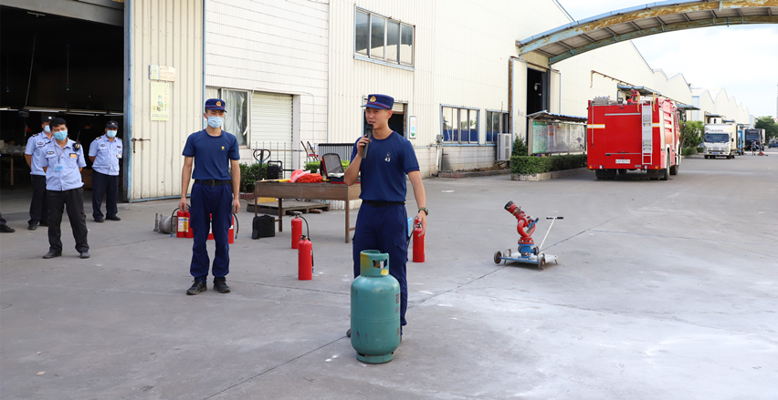 演习开始前,由县消防队人员现场讲解介绍各种灭火器材的性能、用途、使用方法,实际操作演示消防栓的使用方法,并介绍车间现场火灾扑救、应急疏散的方法与要领,同时组织员工开始模拟火情紧急疏散实操演习。