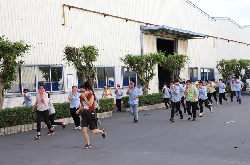 模拟火灾发生后,第一个发现火情的员工迅速按下警铃发出警报,随着消防警铃的响起,安全生产领导小组通过事故广播发出紧急疏散与集合通知,迅速指挥各车间进行紧急疏散,各岗位的员工们立即手捂湿毛巾、弯着腰有条不絮地撤离至紧急集合地。安全疏散后,灭火行动组使用消防器材对着火源进行灭火扑救,救护人员立即救助模拟的烧伤人员,确保员工的安全。
