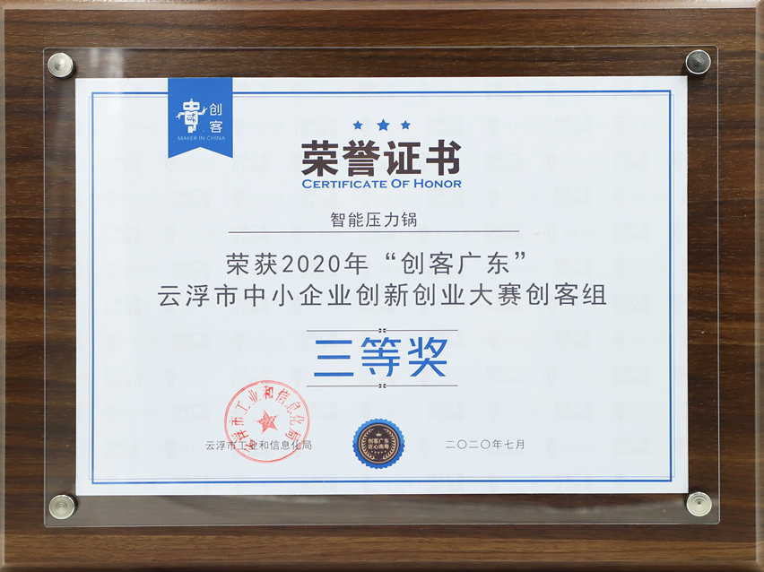 本次大赛以“创客广东 匠心南粤”为主题,聚焦智能制造、机器人等先进制造业以及新一代信息技术、生物医药、绿色低碳、工业互联网、新材料等战略性新兴产业,汇集了云浮市各地区优质科技创新企业及创客项目。在角逐中,“智能压力锅”凭借其智能控制模块,精准控制烹饪时间、压力和温度,获得现场领导嘉宾、专家评委的一致好评,最终斩获创客组三等奖。