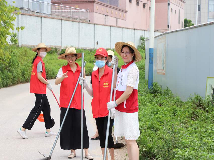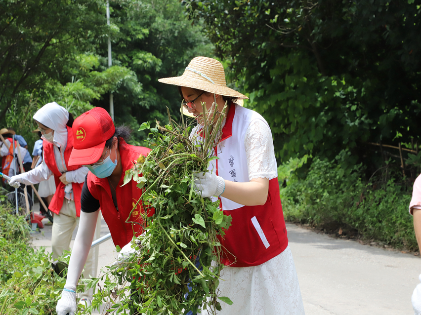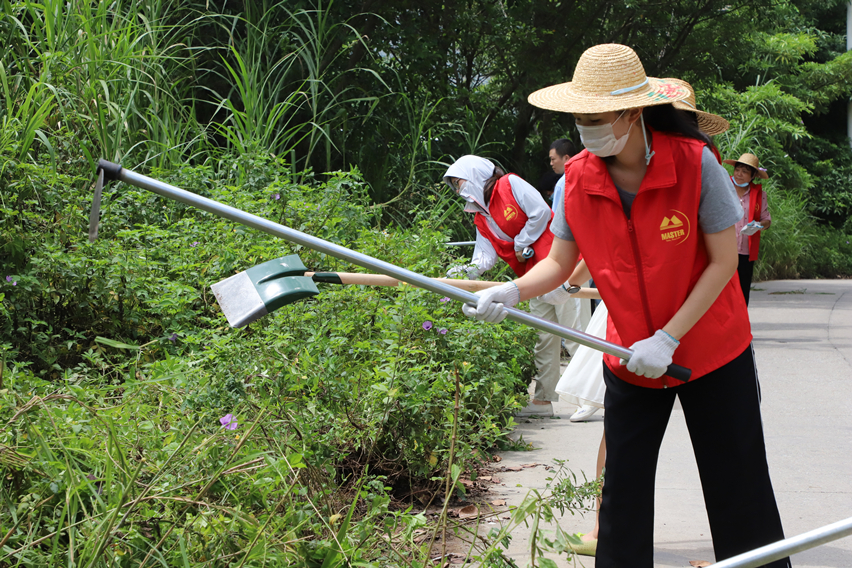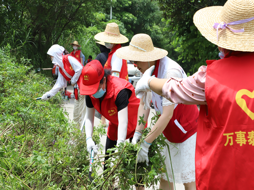 扫把、垃圾铲、铁铲、锄头,这些简单的清扫工具是万事泰“美容师”最得力的助手,杂草、纸屑皆是他们的“眼中钉”。他们顶着高温,无惧脏累,对辖区内的垃圾、杂物展开集中清理。在烈日下,他们热情高涨,使劲挥着手里的锄头,豆大的汗滴流过脸庞,湿透了衣裳,过路的行人纷纷投来敬佩的眼神。他们用自己的双手为附近居民创造了一个干净整洁的生活环境,营造了良好的社会风气。