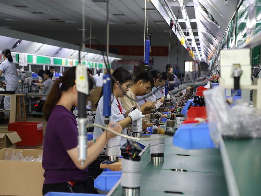 金秋时节,五谷丰登。万事泰电器公司旺季攻坚战正如火如荼。走进电器公司,整个车间一片繁忙景象,随处可见万事泰人匆忙而执着的身影,他们正干劲十足,专注地进行着装配生产,不时会有管理人员穿梭其间,安排与调度。车间内,生产流水线的工作有条不絮,各工序正井然有序地运转,一件件家电被送至生产线,经过加工安装电机、焊接线路板,通过气密性、功能性等系列测试,最后包装出厂。车间外,一台台货车从电器公司缓缓驶出,通往全国各地。