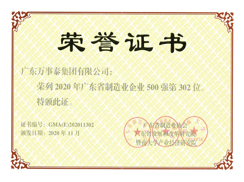 集团讯 11月26日,由广东省制造业协会、广东省发展和改革研究院、暨南大学产业经济研究院共同主办的“2020广东省制造业发展年会暨广东制造业500强企业峰会”在广东中山隆重举行。经审定,万事泰集团凭借行业强大的综合实力,再次荣列“2020年广东省制造业企业500强”。