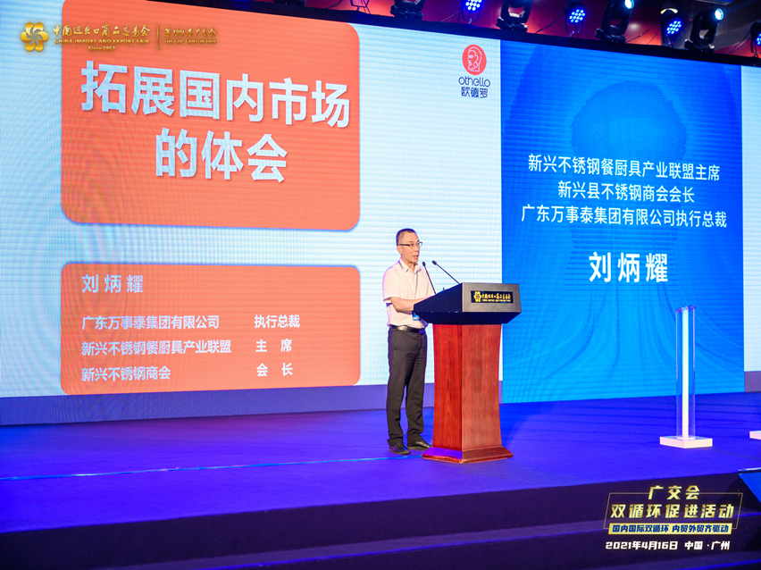 集团讯 4月16日,由中国对外贸易中心、广东省商务厅主办的“国内国际双循环、内贸外贸齐驱动——第129届广交会双循环促进活动”在广交会展馆成功举办。万事泰集团作为广交会品牌企业和CF奖企业,携旗下欧德罗品牌代表产品参加了本次活动,万事泰集团执行总裁刘炳耀受主办方邀请出席活动,并就如何拓展国内市场作实践经验分享。