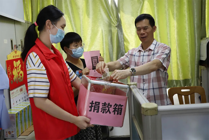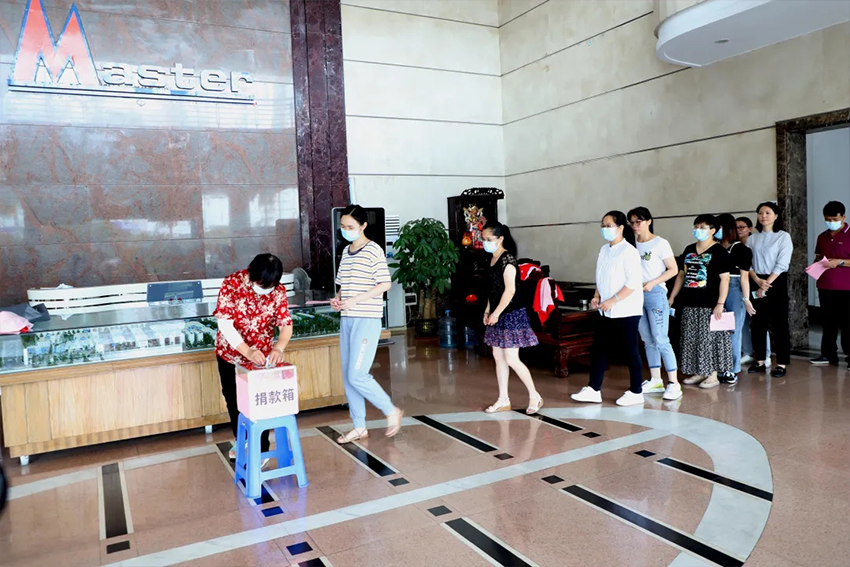 集团党支部、工会组织志愿者分组拿着捐款箱、捐款二维码到各部门、车间进行募捐,志愿者们跑遍了每一个部门,每一个车间,为了使每一个员工都能捐出善款、献出爱心,他们不顾烈日高温,不顾汗水湿透衣服,收集每一个员工的爱心,一边募捐、一边宣传、讲解奉献爱心善心、关心他人的道德观念,志愿者们既向员工募捐到了善款,也给员工上了一堂德、善、美的教育课。