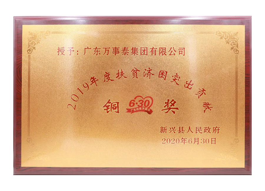 为响应2021年广东省扶贫济困日活动的号召,万事泰集团积极参与“扶贫济困日”活动,被县政府授予2020年度扶贫济困突出贡献铜奖。
