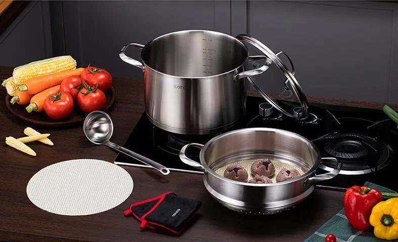 严选18/10不锈钢原材,健康无涂层,耐氧化抗腐蚀,经久耐用。加大水位刻度清晰,方便掌握水量。拉丝抛光工艺,耐污易洁。蒸煮同时进行,一锅多用不串味满足一家使用。受热更均匀,多炉灶通用 。
