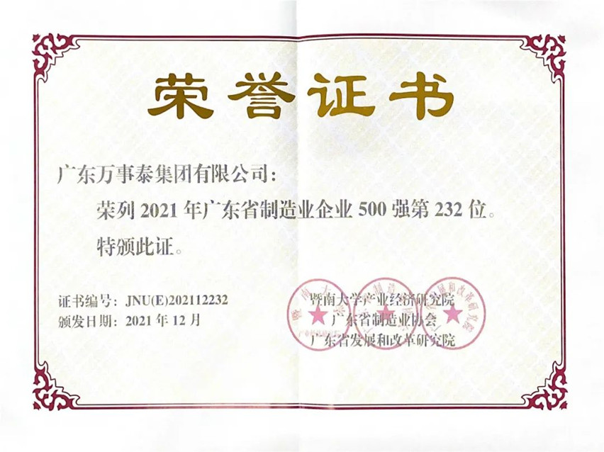 2021圆满收官:万事泰荣列2021年广东省制造企业500强第232位