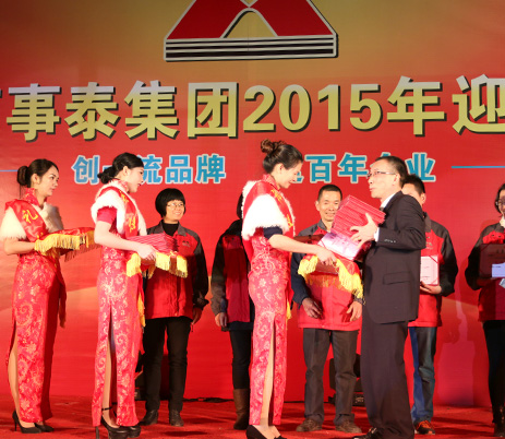 副总裁刘炳耀致祝酒词,他表示, 2014年,在全体员工的努力下,集团取得了丰硕的成果,在新的一年里,希望大家能配合集团蓝图发展规划继续努力工作,为实现万事泰的伟大腾飞添砖加瓦